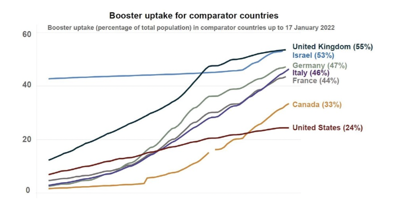 相比之下,以色列(53%)、德国(47%)、意大利(46%)、法国(44%)紧随其后;美国接种率较低——仅为总人口的24%。
