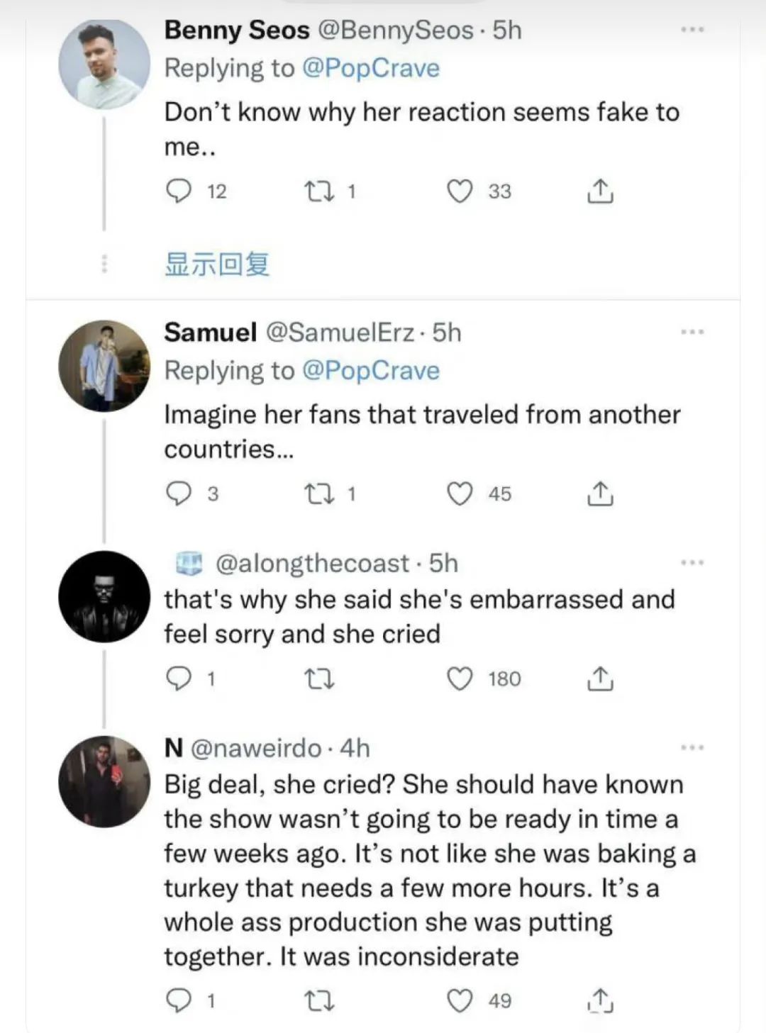 一位粉丝质疑为什么不能提前早一点宣布取消:“我正在飞往拉斯维加斯的飞机上,酒店等全部定好,准备参加明天的开幕之夜。到现在了你才知道节目没有准备好?现在才拿到核酸检测?你可以提前更早取消的,这对于我们坐飞机来看,甚至很多从海外飞来的粉丝来说实在是太不公平太残忍了!”