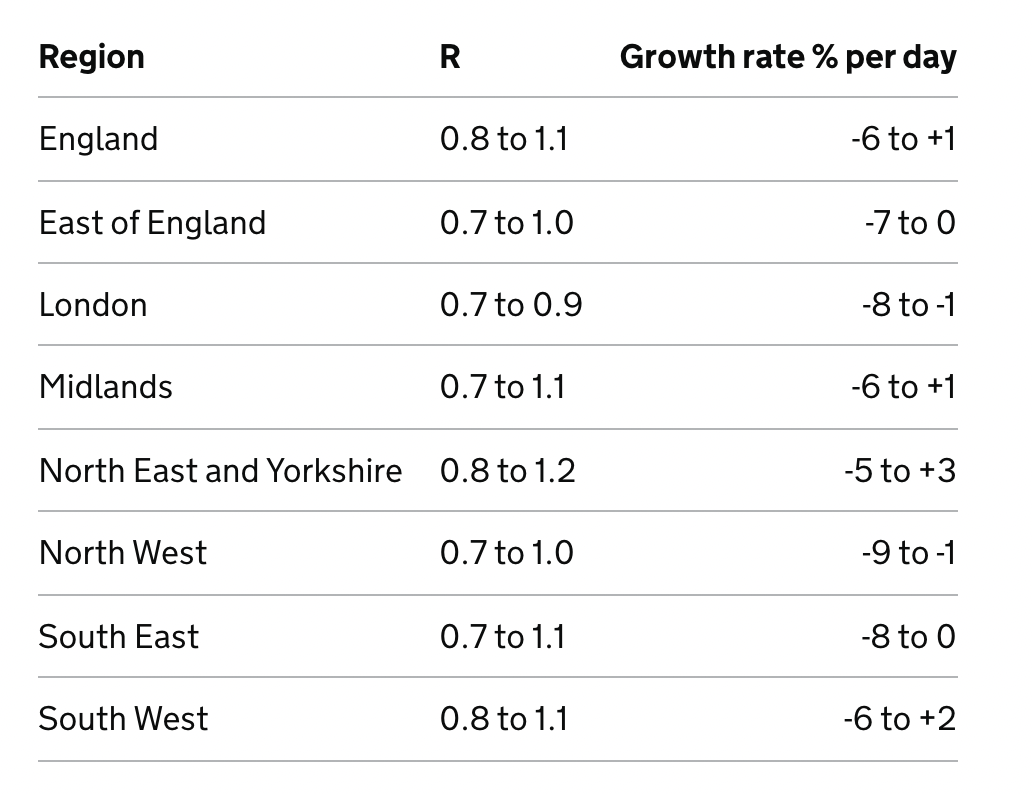 英国各地区当中疫情状况最好的为伦敦:0.7-0.9并且仍在大幅下降。