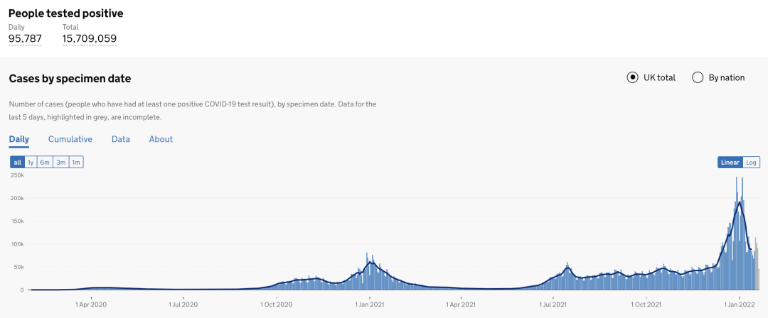 截止至2022年1月21日(周五)英国时间09:00,累计检测结果量434,562,577(+1,370,093);累计确诊15,709,059例(+95,787);累计病亡153,490(+288)。