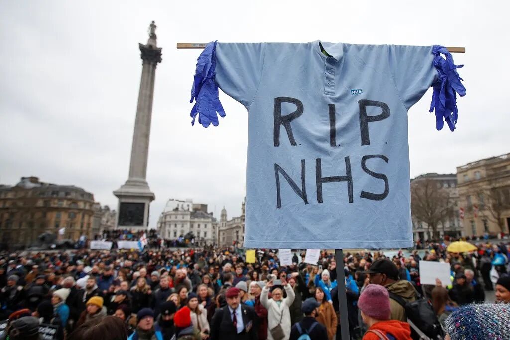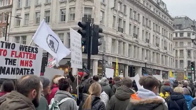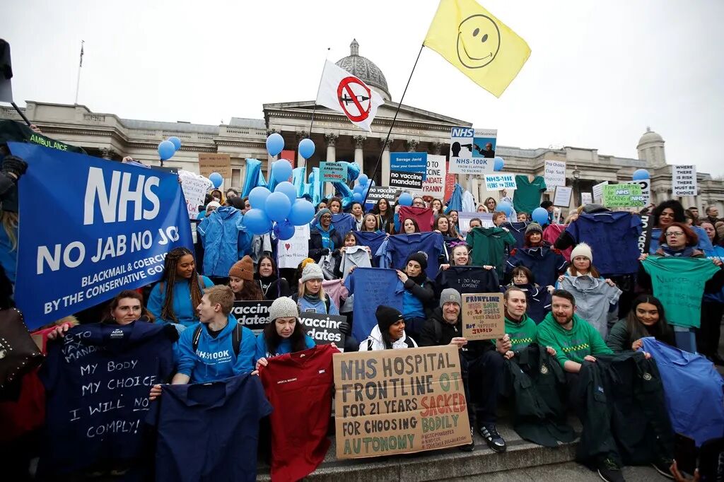 众多抗议者和国家医疗服务系统(NHS)的工作人员1月22日(周六)在伦敦市中心特拉法尔加广场举行游行,抗议政府强制要求接种疫苗的决定。