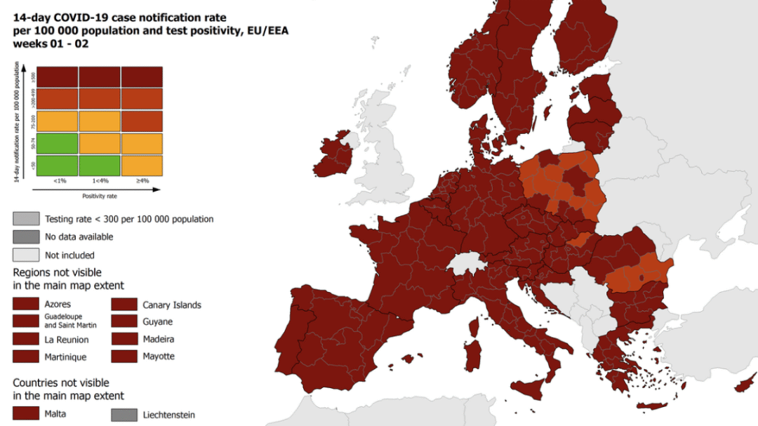 欧洲疾病预防和控制中心(ECDC)早些时候公布的最新疫情地图显示,过去七天,欧洲大陆的新冠感染病例一直在迅速增加,平均估计每10万欧洲居民中有超过500例感染。