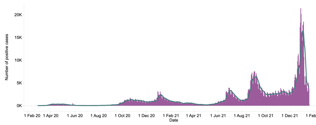 截止至2022年1月23日(周日)英国时间09:00,累计检测结果量434,562,577(待更新);累计确诊15,859,288例(+74,799);累计病亡153,862(+75)。