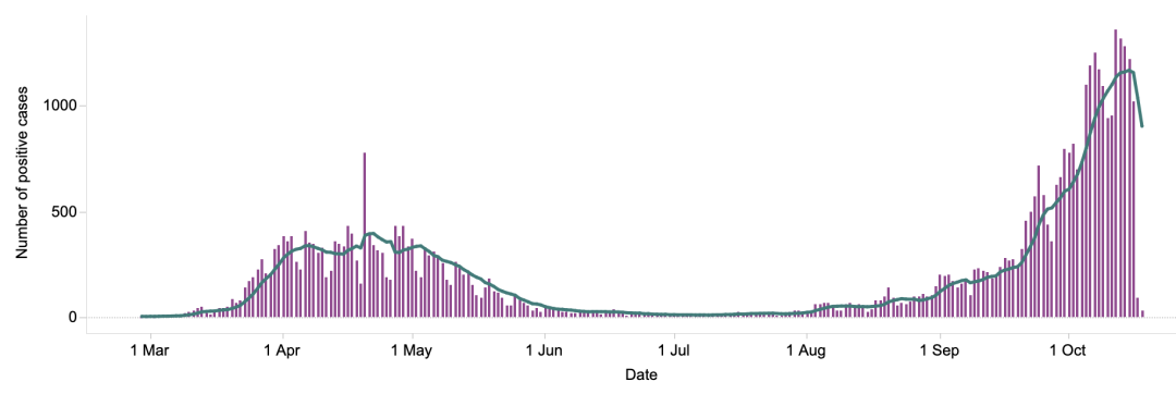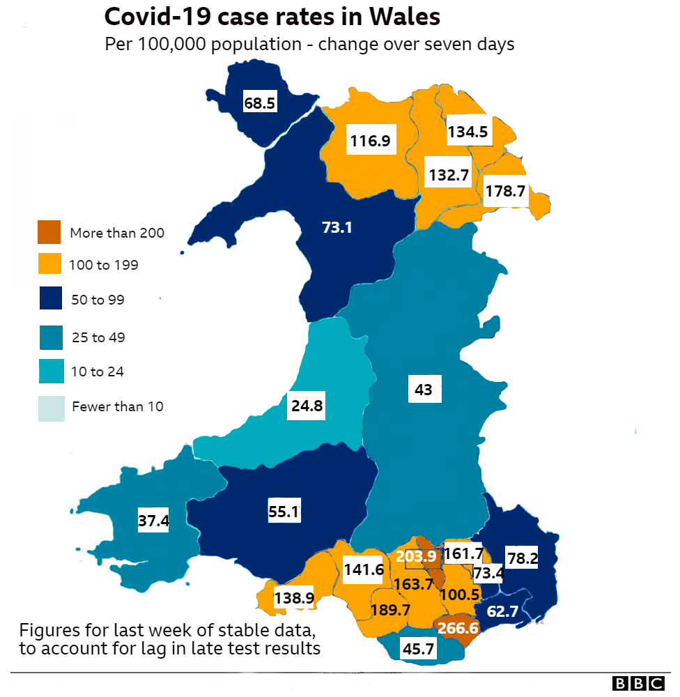 根据最近威尔士疫情数据,在过去7日内,每10万人中有130例确诊案例;10月9日至15日之间,威尔士全境新增确诊4,127例。