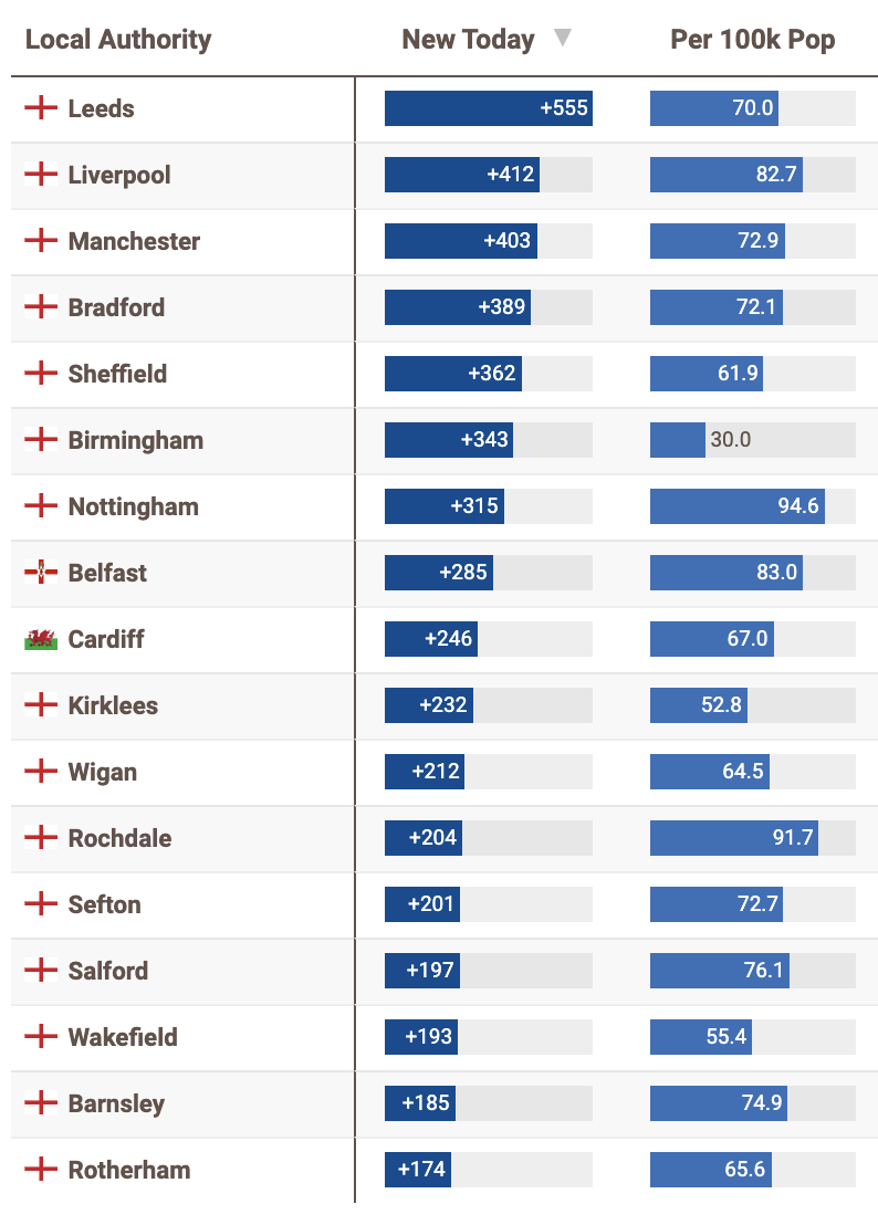 10月18日(周日),新增确诊数量最多的城市为利兹(+555)。
