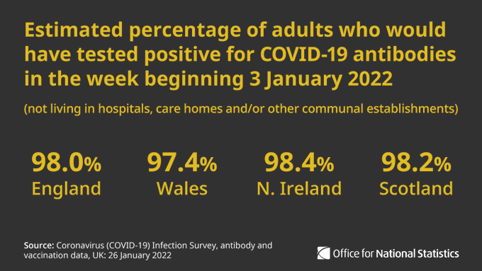 国家统计局(ONS)的最新数据显示,在2022年1月3日开始的一周内,估计英国各地区新冠抗体检测呈阳性的成年人数仍超过90%。