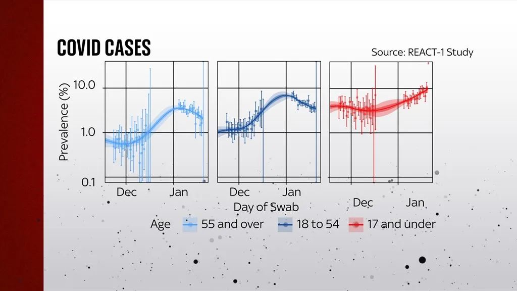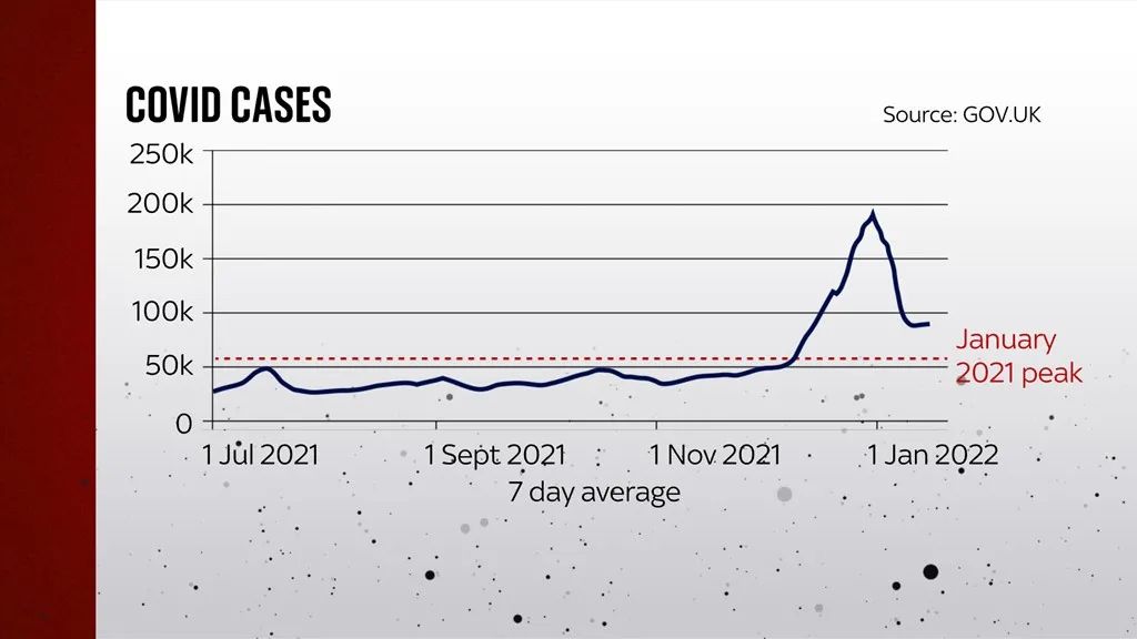 最新数据估计,在截至1月22日的一周内,英格兰家庭中每20人中有1人可能感染过新冠,即260万人,低于前一周的300万人。