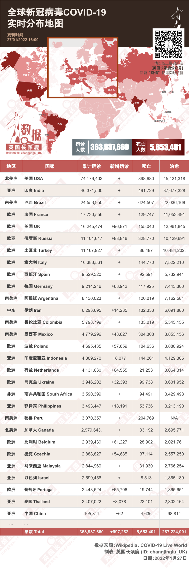 世界的累计确诊人数截止2022年1月27日17:00超过3亿6,393万例(*),死亡超过565.3万例(+14k)。