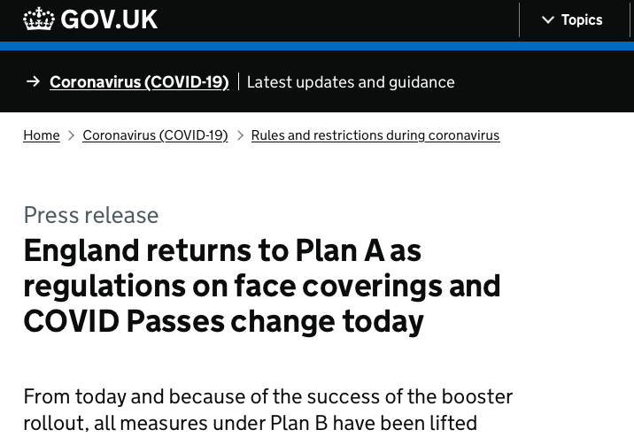 从1月27日周四00:01起,英格兰正式取消B计划限制措施,恢复A计划。