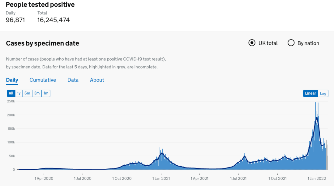 截止至2022年1月27日(周四)英国时间09:00,累计检测结果量442,585,782(+1,446,064);累计确诊16,245,474例(+96,871);累计病亡155,040(+338)。