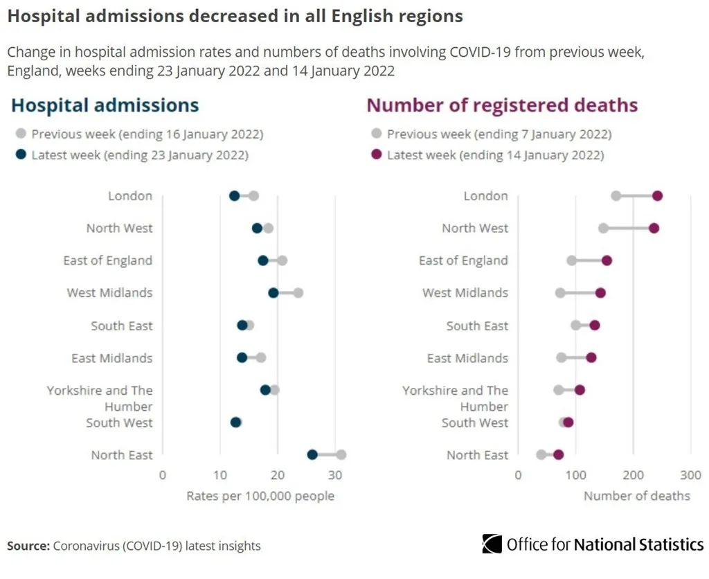 国家统计局(ONS)关于新冠住院的数据显示,在截至2022年1月23日的一周内,英国所有地区的住院人数都有所下降。其中东北部地区的下降幅度最大,但比率仍最高。