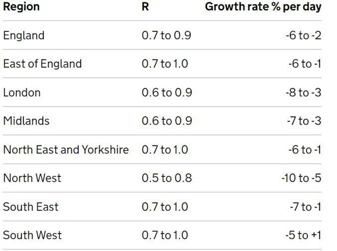 英格兰R值降至0.7-0.9