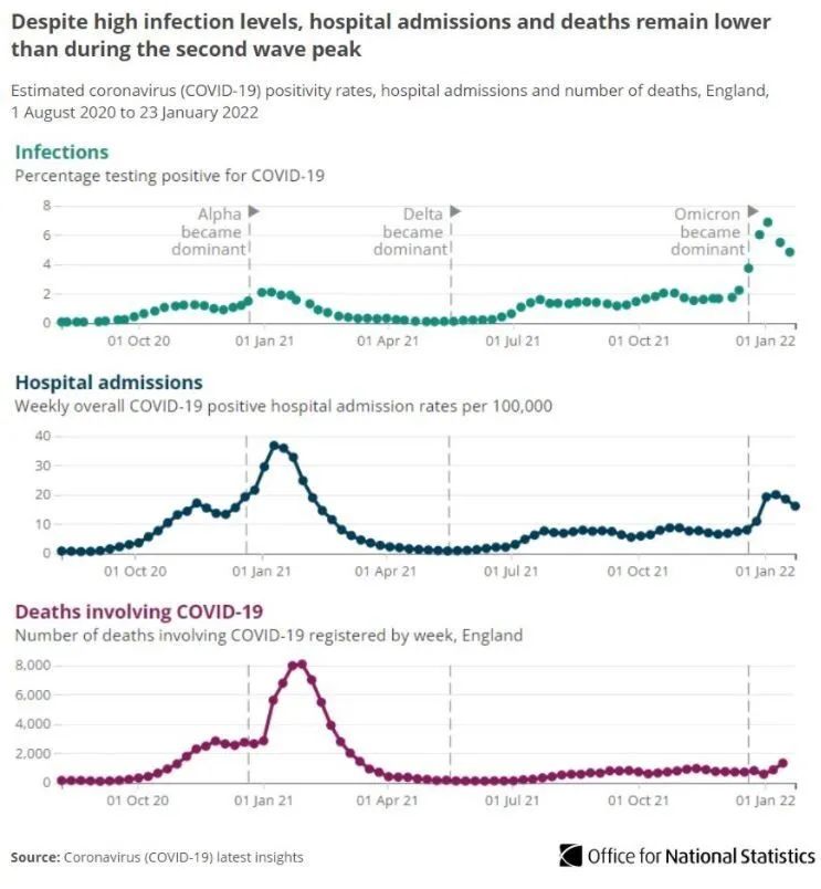 截至1月22日的一周,英格兰感染率下降至4.82%;住院率持续下降。而截至1月14日一周的死亡率则有所上升。