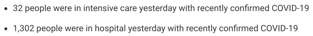 从2021年3月5日以来,苏格兰地区共有30,314名(+231)确诊患者出院。截至1月28日午夜,近期住院的疑似/确诊新冠患者1,302名(-87),其中32名(=)确诊新冠在重症监护室ICU。