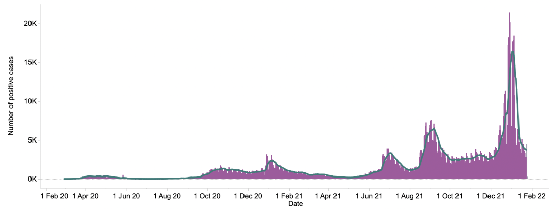 截止至2022年1月30日(周日)英国时间09:00,累计检测结果量443,980,077(待更新);累计确诊16,468,522例(+62,399);累计病亡155,698(+85)。