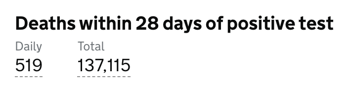 目前英格兰地区使用呼吸机的新冠患者有432人(-17);病亡新冠患者总计137,115人(+519)。