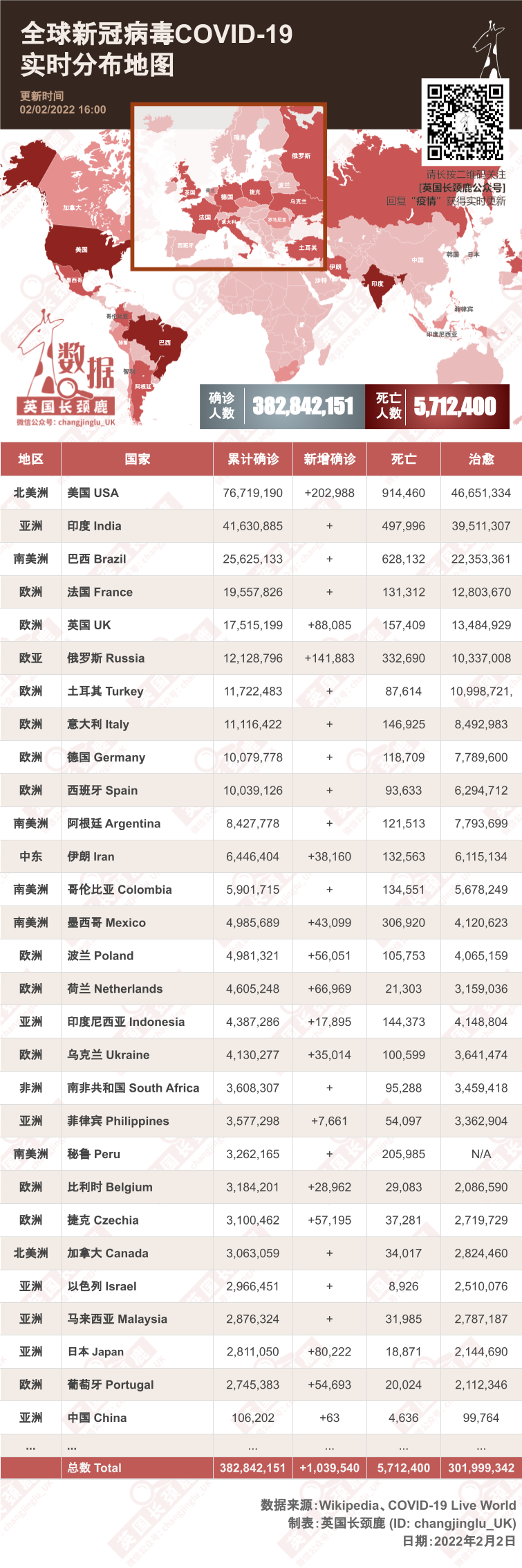 世界的累计确诊人数截止2022年2月2日17:00超过3亿8,284万例(*),死亡超过571.2万例(*)。