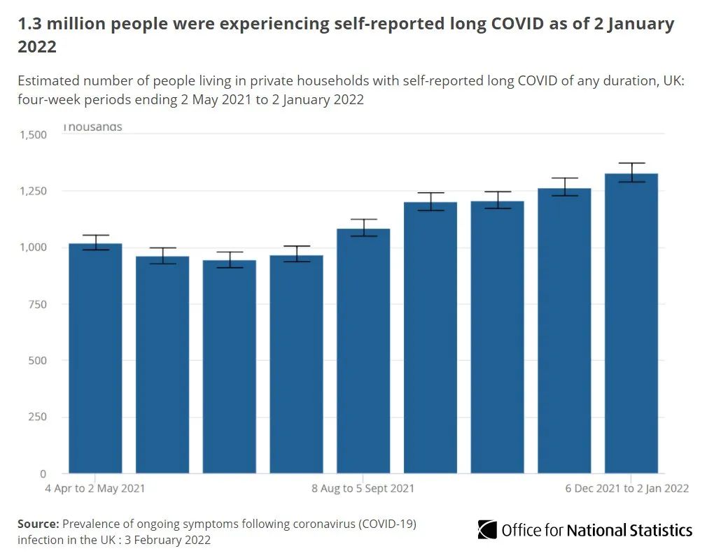 国家统计局(ONS)在12月6日至1月2日期间的数据显示,约有133万生活在英国的人正在遭受长期新冠症状的影响,大概48人中就有一人,约占人口的2.1%,比12月初的127万有所增加,已经攀升至英国疫情开始以来最高记录。