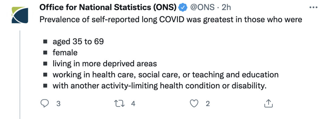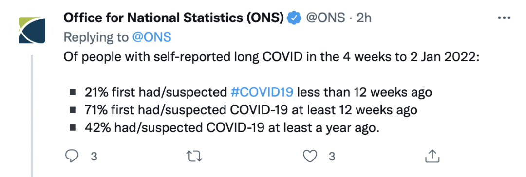 国家统计局的最新数据显示,在自我报告出现长期新冠症状患者中,有28万人(21%)在不到12周前首次感染或疑似感染新冠。