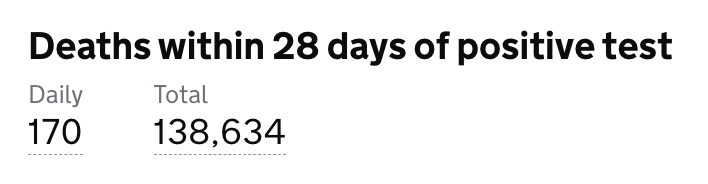 目前英格兰地区使用呼吸机的新冠患者有384人(=);病亡新冠患者总计138,634人(+170)。