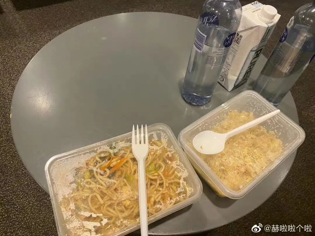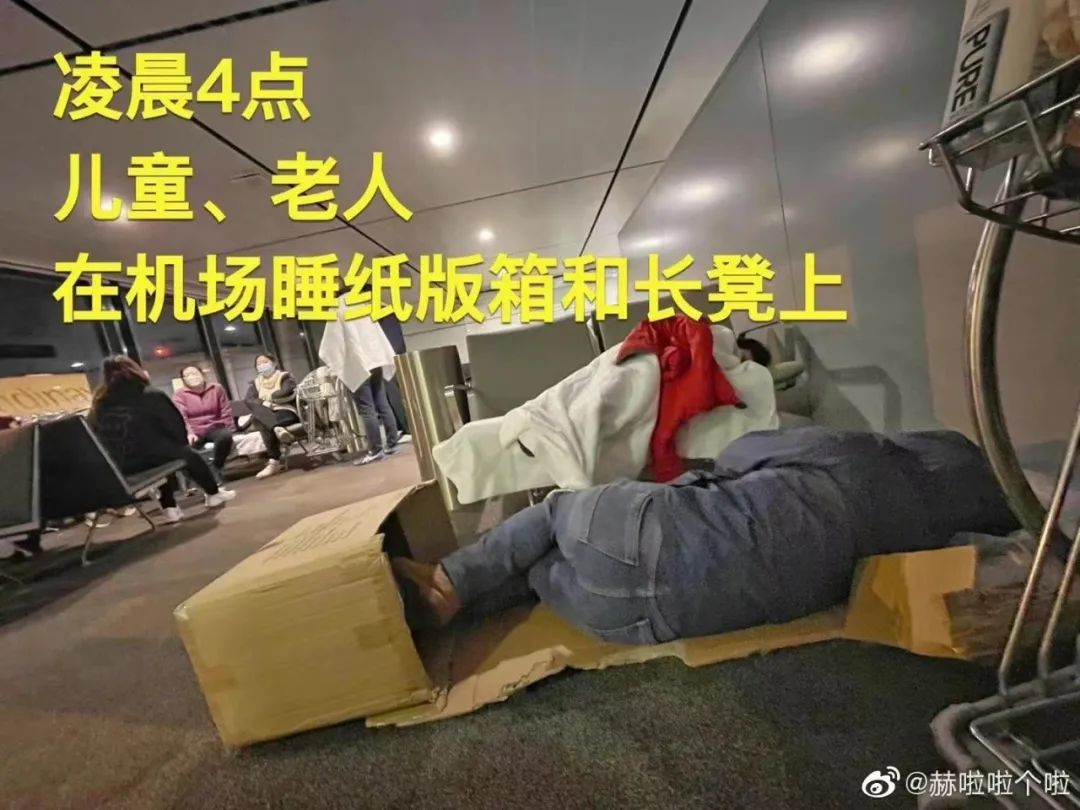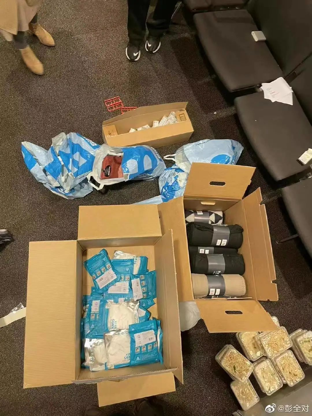 在前线滞留小伙伴们提供的图片可以看到,机场方面未重新安排住宿,只能把纸壳铺在地上,或在勉强挤在两张椅子上入睡。餐食也以简单的快餐解决。