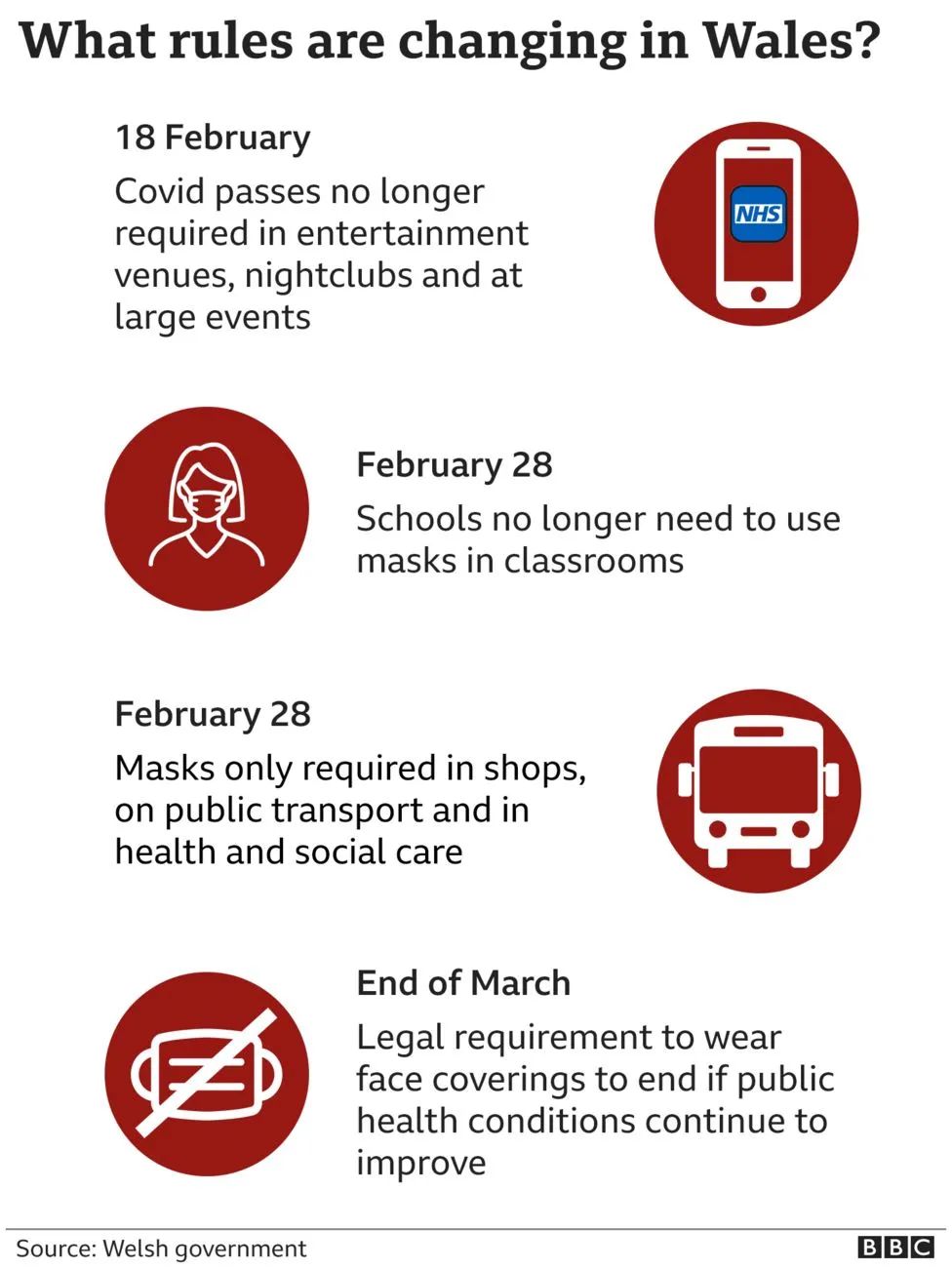 2月11日(周五),威尔士首席大臣Mark Drakeford表示,病例率的下降意味着可以开始放松剩余的新冠限制。其中,要求威尔士人戴口罩的法律可能会在3月底被废除。