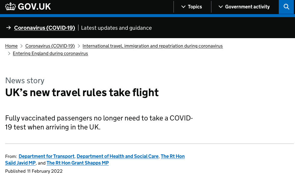 根据英国政府官网的更新,2月11日(周五)凌晨4:00起,取消所有针对完整剂量疫苗*接种旅行者的检测要求,入境者只需在入境前48小时内填写一份简化的旅客定位表。