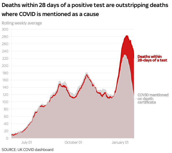 上图中红色数据记录了所有在检测呈阳性后28天内死亡的人。其优势是更新快,可提供每日死于新冠的最新数字。该数字也被用于英国新冠病毒表格。