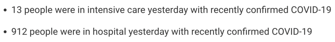 从2021年3月5日以来,苏格兰地区共有32,056名(+107)确诊患者出院。截至2月16日午夜,近期住院的疑似/确诊新冠患者912名(+1),其中13名(=)确诊新冠在重症监护室ICU。