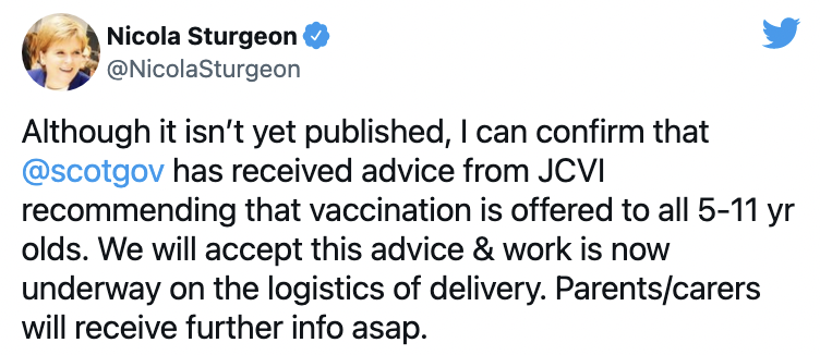 卫生部长Sajid Javid表示:JCVI的建议是在官方独立药品监管机构MHRA进行彻底审查之后提出的,MHRA批准辉瑞公司的疫苗对5至11岁的儿童是安全和有效的。