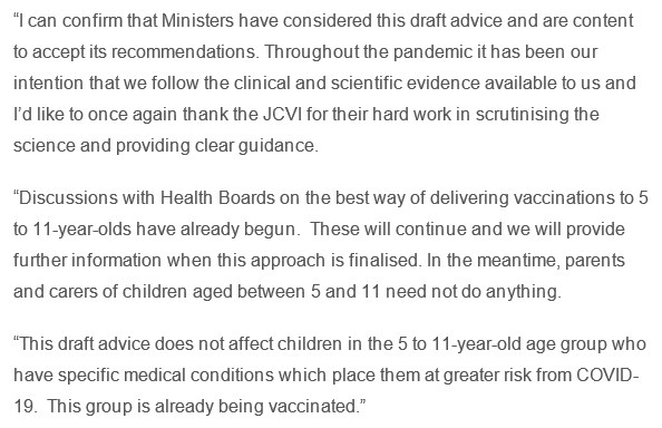 卫生部长Sajid Javid在为英格兰做出决定时说,他已经接受了独立的疫苗接种和免疫联合委员会JCVI建议;北爱尔兰卫生部长Robin Swann确认效仿。