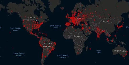 全球新冠感染分布图 | 图片来源John Hopkins University