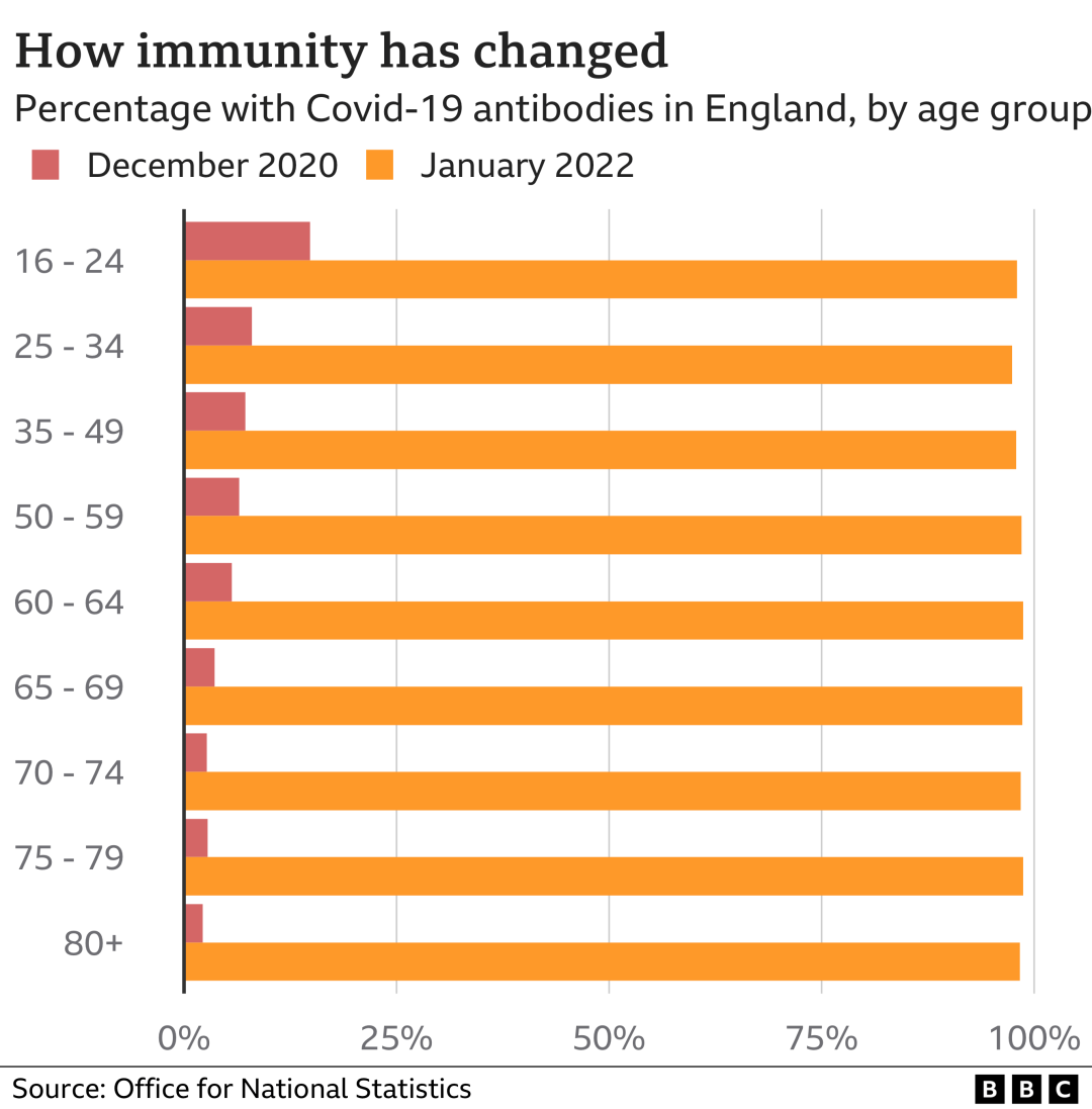 通过英国成功推广其疫苗接种计划,截止目前,16岁以上的所有年龄组中,至少有97%的人已有新冠病毒抗体。