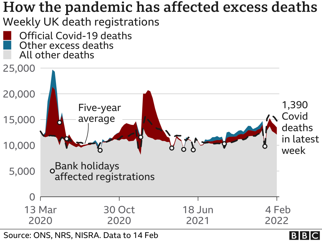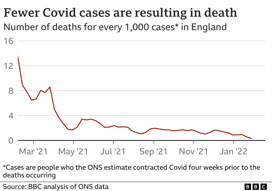 英国第一轮疫情时,人体还未针对新冠病毒建立起免疫系统,导致死亡人数激增。总死亡病例中,约80%在新冠疫情发生的一年内记录的。现在,新冠死亡率已大幅下降。
