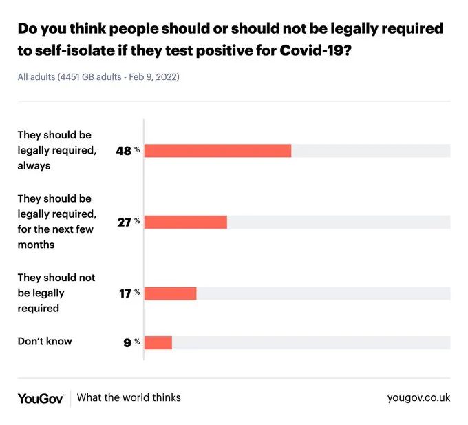 工党议员Richard Burgon在社交媒体上发布的一项YouGov民意调查显示,45%的人认为,如果病毒检测结果呈阳性,就应该依法进行自我隔离;27%的人认为应该在未来几个月内照常执行自我隔离。