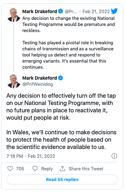 威尔士政府2月21日上午对鲍里斯结束免费新冠检测的报道作出了回应。首席大臣Mark Drakeford说:“任何改变现有国家检测计划的决定都是不成熟的,也是鲁莽的。