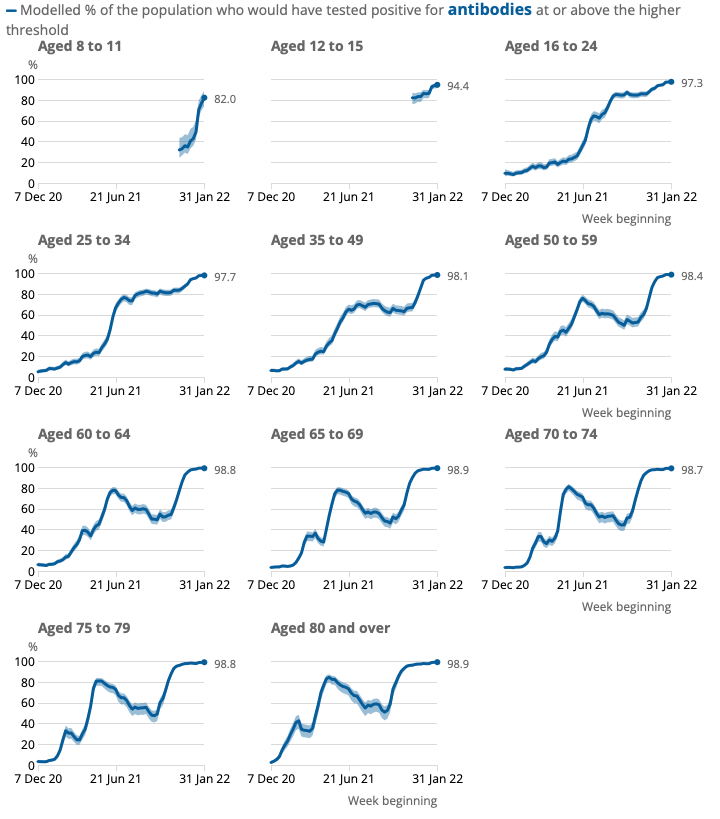 在整个英国,12至15岁儿童的抗体水平为91.7-95.1%;8至11岁儿童抗体水平为72.2-82.0%。