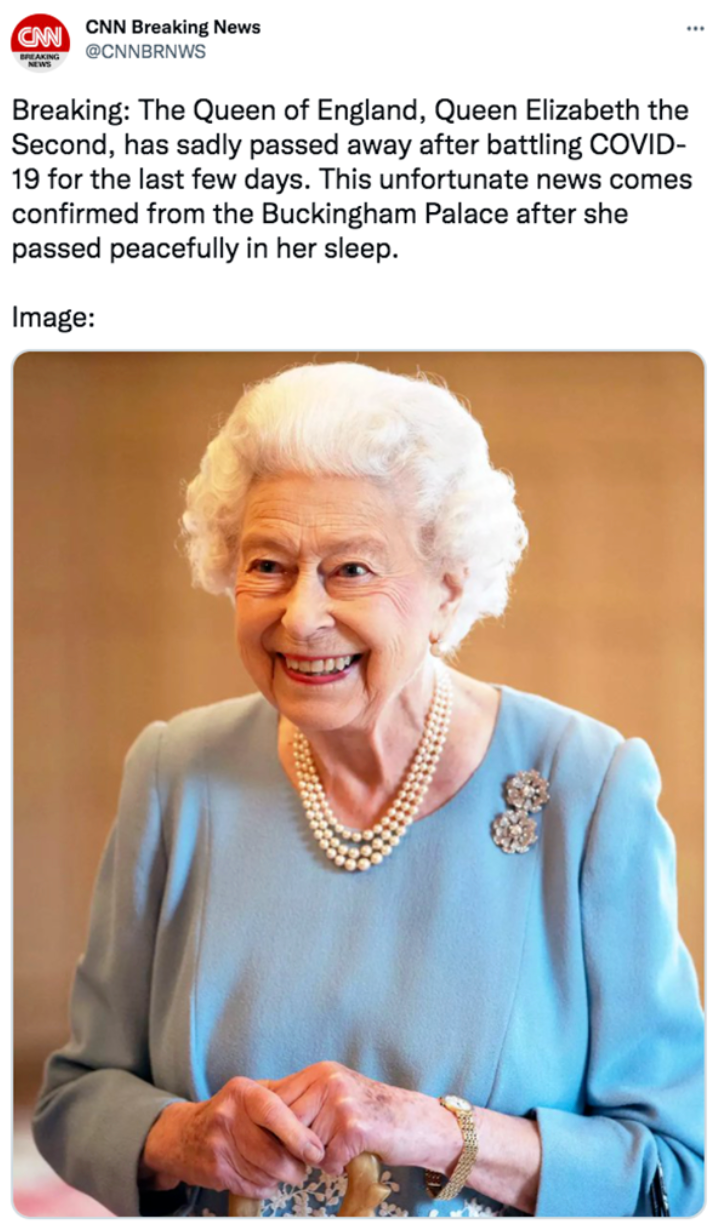 一个疑似CNN的官方账号也随之发布了相关女王去世的新闻!