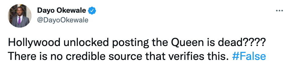 尽管白金汉宫没有发布任何公告,但这一顿“官方猛如虎”的报道在社交媒体上迅速传播开来...直到英国上议院参谋长Dayo Okewale发文回应,关于女王死亡的报道是“绝对虚假的”,并打上了#False的标签。