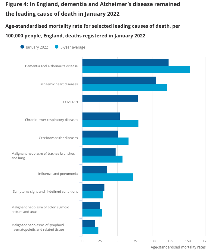 综合以上数据,新冠死亡已成为英格兰和威尔士1月份的第三大死因。比2021年12月上升一位。