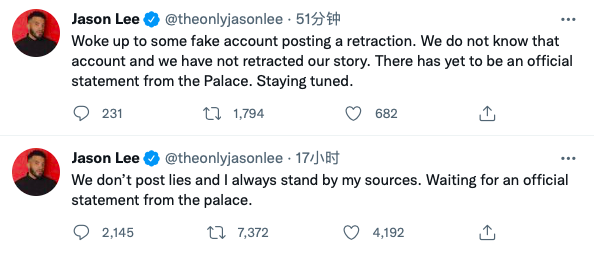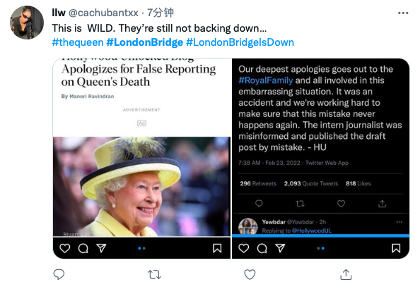 2月22日(周二)晚,在外网社交媒体拥有大量粉丝的名人新闻媒体Hollywood Unlocked报道称,「英国女王已因感染新冠去世」。其创始人Jason Lee随后也报道了此事。