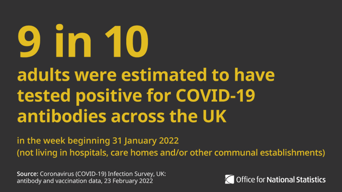 据国家统计局(ONS)公布的最新每月新冠病毒数据,从1月31日开始的一周内,每10个英国成年人中就有9人在新冠抗体检测中呈阳性。