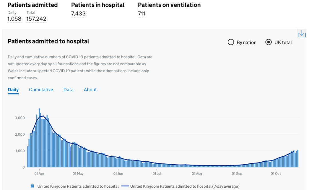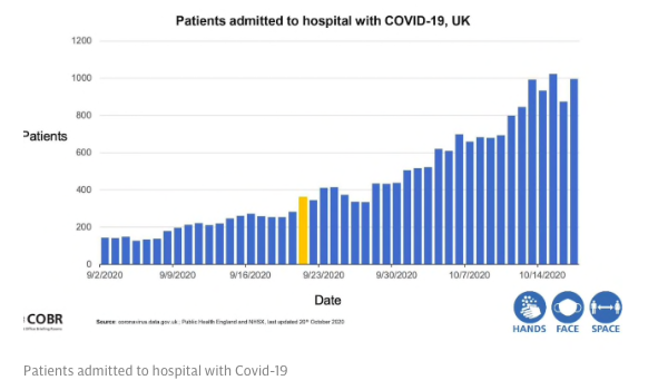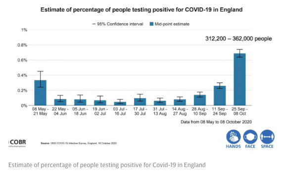首席科学顾问帕特里克-瓦兰斯(Patrick Vallance)在发布会上发布了国家统计局的数据,包括英国五月至十月检测呈阳性的人数百分比和9月2日至10月14日以来因病毒入院的患者数量变化。