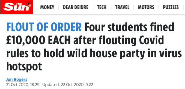 周二(10月20日)晚上,诺丁汉特伦特大学(NTU)的四名学生因违反Covid-19限制在家中举办了一场有30多人派对被警方发现,处以每人£10,000的罚款,并被停学。