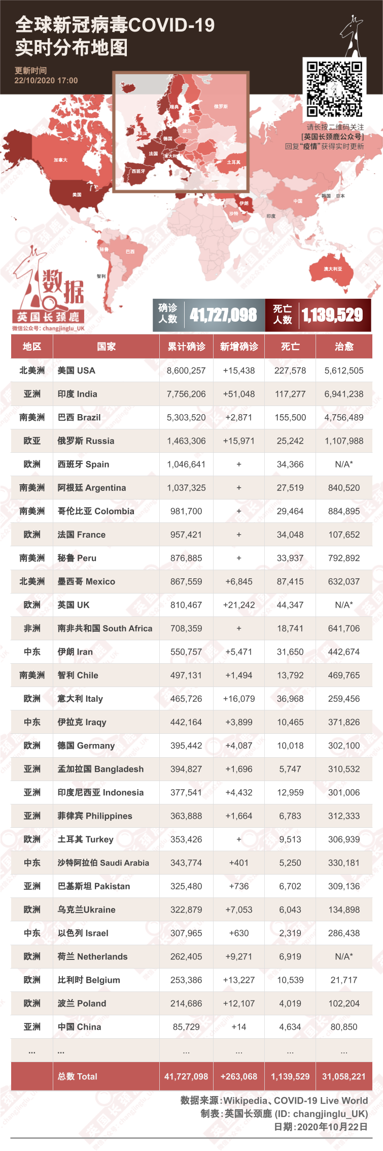 世界的累计确诊人数截止10月22日17:00超过41,727万例(+601k),死亡超过113.9万例(+7k)。