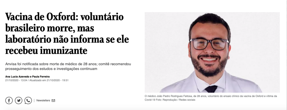 据巴西《环球报》(O Globo)报道,这名死亡志愿者年仅28岁,是里约热内卢一家医院的医生。今年7月底,接种牛津大学和阿斯利康联合研发的新冠疫苗,9月感染新冠病毒,于10月15日因新冠肺炎并发症死亡。巴西卫生当局以保密协议为由,没有透露有关死亡的细节。有巴西媒体表示,这名志愿者只是被注射了安慰剂,但这一说法并未获官方证实。