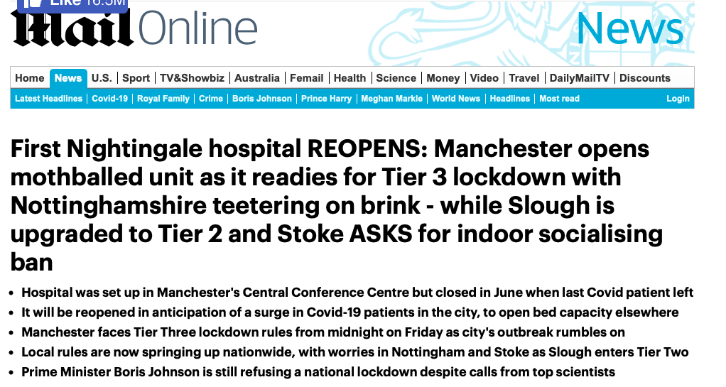 随着斯托克(Stoke)被要求禁止室内社交、斯劳(Slough)升级至第二级封锁、诺丁汉第三等级限制的“警报”拉起,越来越多的城市进入加速封锁阶段,有顶级科学家的呼吁全国封锁,英国首相鲍里斯·约翰逊仍然拒绝,因为他自己的科学顾问认为应继续坚持三级地方制度。