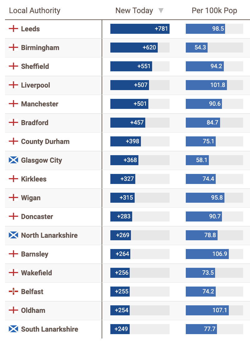 10月21日(周三),新增确诊数量最多的城市为利兹(+781)。