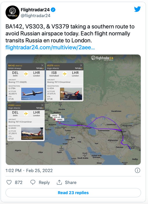 Flightradar24的跟踪数据显示,英国航空公司和维珍大西洋公司在德里Delhi、伊斯兰堡Islamabad和伦敦之间的南方航线已经采取了避开俄罗斯领空飞行的路线。