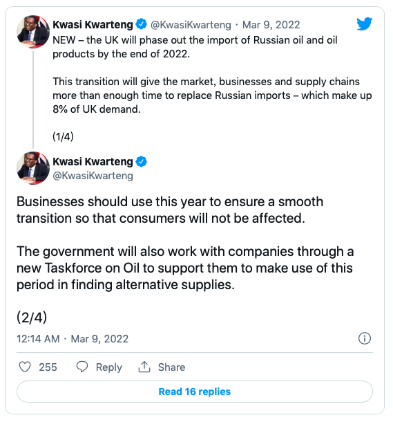 商务大臣Kwasi Kwarteng在社交媒体上表示,英国的过渡期将给其“市场、企业和供应链足够的时间找到取代俄罗斯进口的方法”。